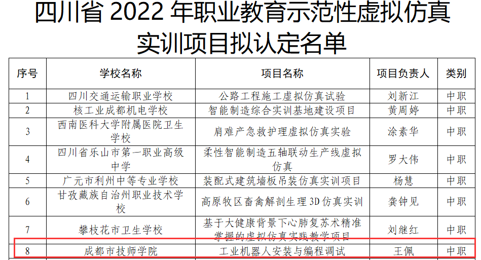 根据四川省教育厅发布的《关于公布四川省 2022 年职业教育示范性虚拟仿真实训项目认定结果的通知》川教函〔2023〕44号,成都市技师公司yl7703永利集团的“工业机器人安装与编程调试”项目经公司推荐、组织形式审查、专家评审,最终成功入选。此次成功入选四川省2022年职业教育示范性虚拟仿真实训项目,进一步提升了公司虚拟仿真实训项目的影响力。公司将继续深化虚拟仿真实训教学改革与创新,为公司三名工程建设、职业教育的高质量发展提供有力支撑。