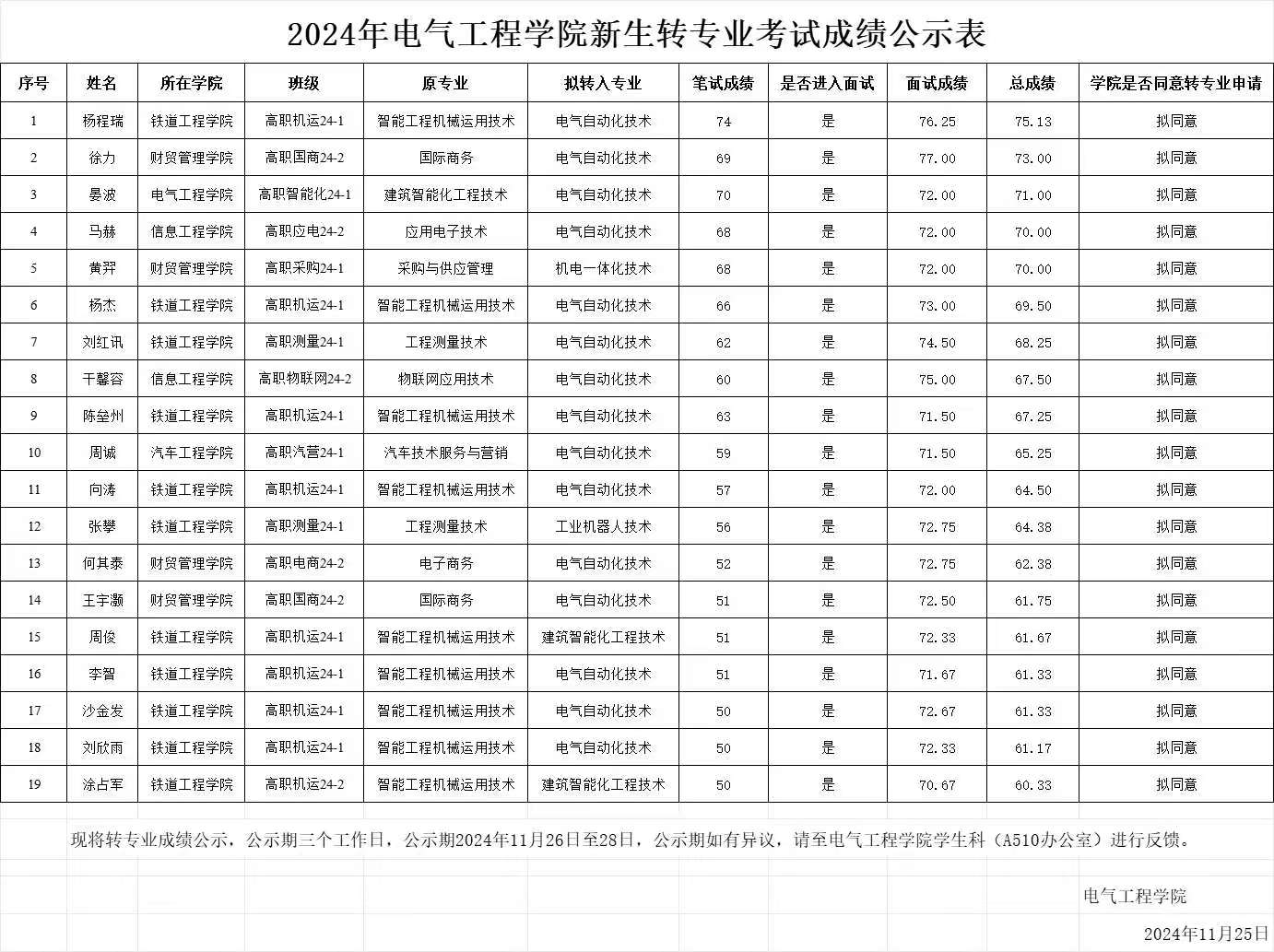 关于2024年yl7703永利集团新生转专业考试成绩的公示